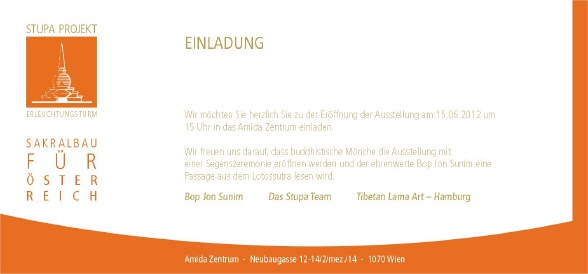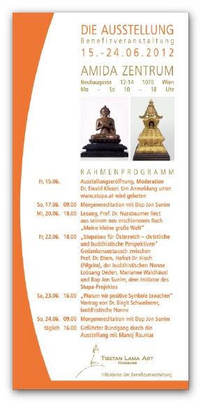 Im buddhistischen Amida Zentrum in Wien-Neubau ist am Freitagnachmittag eine Ausstellung mit Statuen, Stupa-Plastiken und Thangkas (buddhistische Rollenbilder) eröffnet. Beim Pressegespräch am Vormittag wurde die Gemeinde Schwarzenbach im südlichen Niederösterreich als potenzieller Standort für einen Stupa präsentiert, also ein symbolisches Denkmal für Buddha und den Dharma.