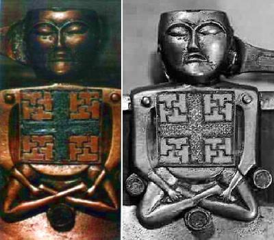 Interessant ist hier, dass die 2 Abbildungen eine Swastika auf der Brust zeigen. Sie steht für die alte 4-Elemente-Theorie aus der alten westlichen mythologischen Welt, wie auch für die vier Himmelsrichtungen.