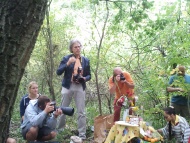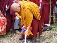 The place for the new temple is located in the dense forest surrounding the Stupa. His Holiness the Drikung Kyabgon Chetsang, accompanied by Venerable Khenchen Konchog Gyaltsen, who happened to be on a teaching tour in Europe, performed the groundbreaking and blessing ceremony of the land on July 15. Also present and participating in the ritual was Bob Jon Sunim, as well as Lama Tsering, Lama Kunsang, and Ani Khandro from Drikung Kagyu centers in Germany, Switzerland, and Sweden respectively. His Holiness gathered with monks and nuns surrounded by many Sangha members from Hungary and from other European countries on a small clearing in the woods. There the rituals were performed according to ancient astrological calculations, by creating a grid with flour on the ground to ascertain the position of the Sadag (sa bdag), the earth-owning spirit. Once the orientation was determined by placing a large image of the Sadag on the ground, the exact spot of the ground breaking was ascertained. At this point a special Sadhana was recited in Tibetan while Bob Jon Sunim recited a text from the Lotus-Sutra. After that, His Holiness broke out a piece of earth with a pickax which subsequently was examined according to colors and texture for signs, which proved to be favorable.