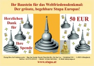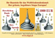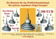 Um diesen Platz zu erschaffen, benötigen wir jede Unterstützung. Nur durch finanzielle Zuwendungen wird es uns gelingen, inmitten eines extra dafür angelegten Parkgeländes einen in der ganzen Welt einmaligen Stupa zu errichten. Außergewöhnlich in seinen Ausmaßen, unverwechselbar in seiner architektonischen Gestaltung. Helfen Sie mit, diesen Ort der Stille und Besinnung und zugleich diesen Ort der Begegnung, wo Vorträge, Konferenzen und Gespräche stattfinden, Wirklichkeit werden zu lassen.