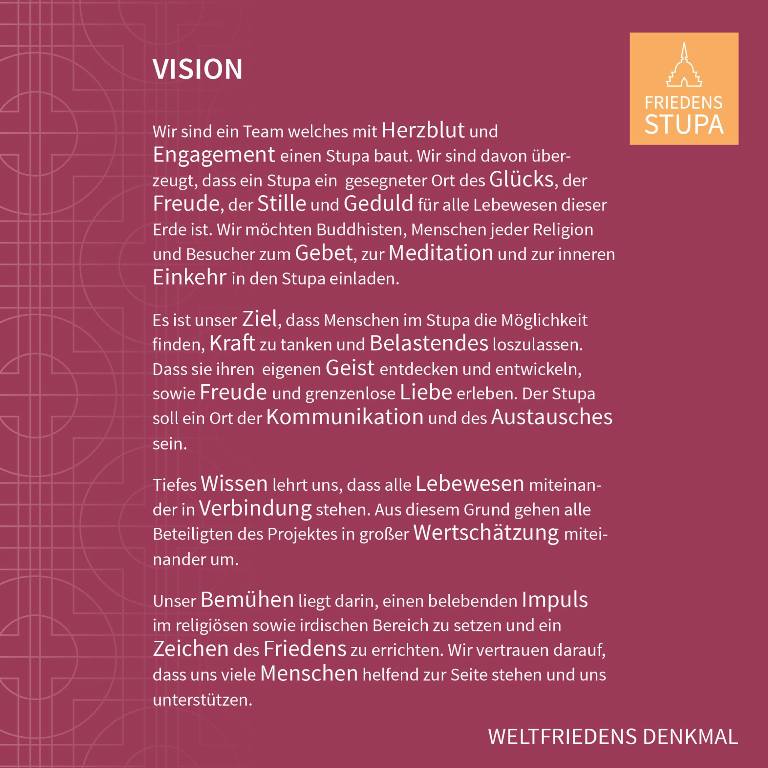 Diese Stupa, die für den Weltfrieden errichtet werden soll und einen Ort der Stille, Einkehr und des Gebetes darstellen wird, setzt hier nicht nur ein positives Zeichen – viel mehr ist sie auch - aus schamanischer Sicht- einer der vielen Ankerpunkte, die es jetzt zu setzen gilt um das, was noch auf uns zukommen mag, in eine gute Richtung wenden zu können. Unser schamanisches Anliegen ist hier, energetisch wertvolle, friedliche und heilige Plätze miteinander zu verbinden und zu vernetzen. Weltweit arbeiten momentan viele Schamanen, Buddhisten, Christen - Menschen aller Glaubensrichtungen und Philosophien - individuell und kollektiv daran, heilende Felder zu schaffen und zu sichern, damit das Projekt „Frieden, Ausgleich und Harmonie“ gelingen kann und wir den Übergang in diese neue Zeit schaffen können.