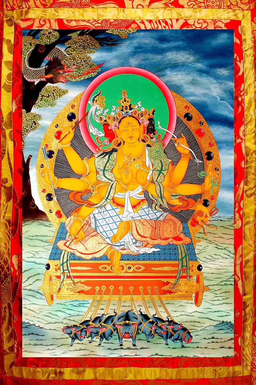Buddhas große Marici Boddhisattva Sutra Marici wird auch mit „Lichtstrahl" übersetzt. Sie wird als die Glorreiche, die Ruhmvolle, die Sonne der Fröhlichkeit und des Glücks bezeichnet. Sie zeigt sich auch als junges Mädchens mit goldener Farbe und Himmelskleidung.Sie hält eine Lotosblume in einer Hand, in der anderen Hand hält sie Nadel und Zwirn. Auf ihrem Scheitel trägt sie einen Juwelen Stupa. Umgeben ist sie von einem Kranz aus blitzenden Strahlen. Ihr Mantra OM MARICI SVAHA kann Krankheiten heilen.